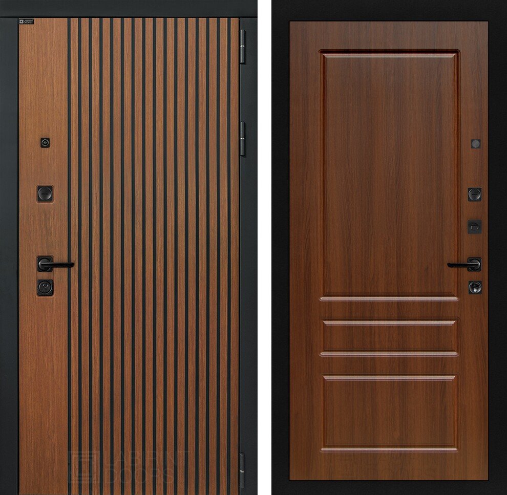 Фурнитура в черном цвете: Броненакладка врезная, накладка со шторкой, глазок , дверная ручка, ночная задвижка. Цилиндр ключ-вертушка Apecs, регулируемый эксцентрик.